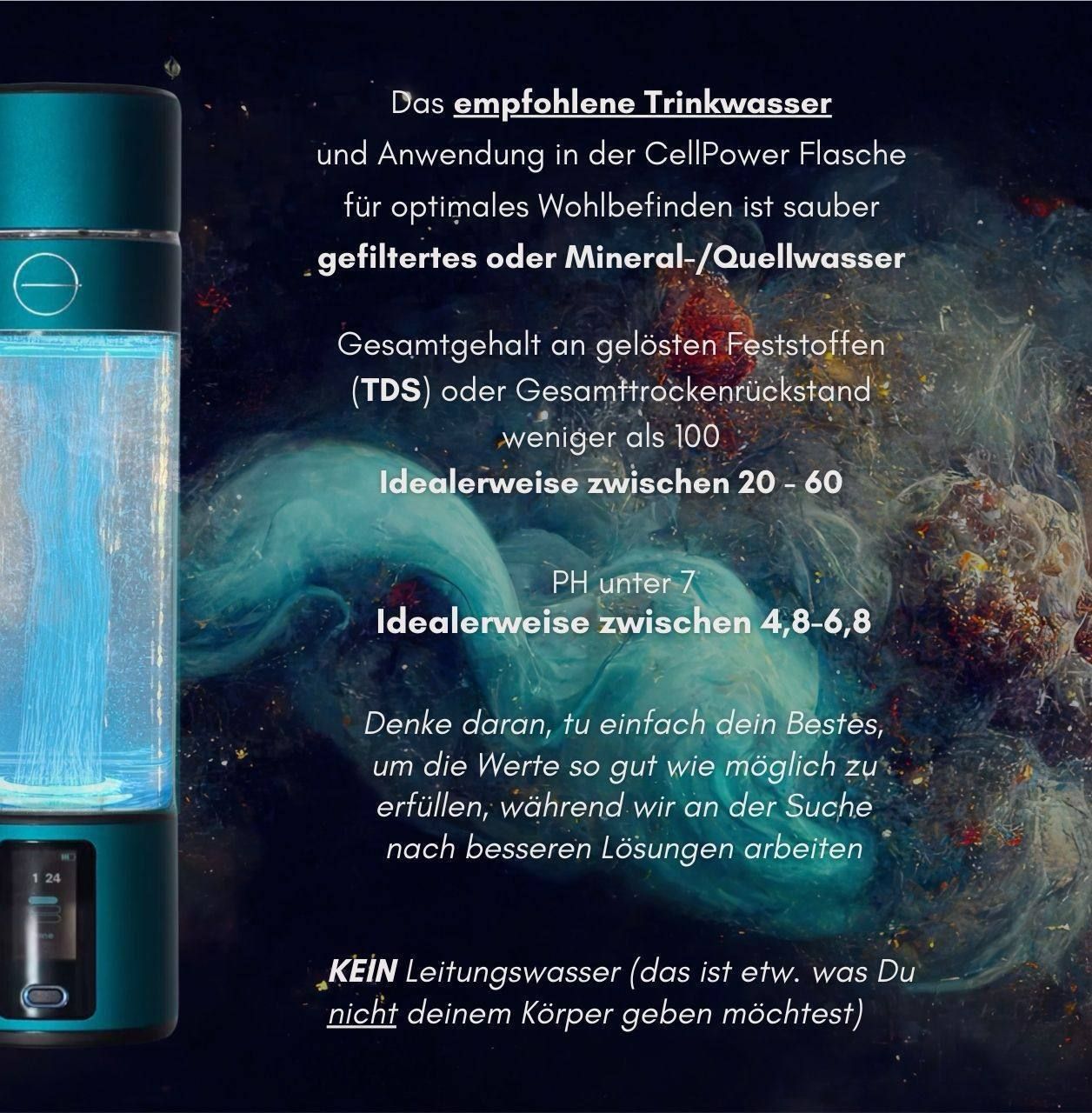 WICHTIG: Fülle nichts außer gefiltertem oder abgefülltem Trinkwasser gemäss untenstehenden Parameter in die LumiVitae-Flasche. Wenn Du etwas anderes als Wasser (auch ungefiltertes Leitungswasser!) verwendest, wird die Lebensdauer der Flasche verkürzt.